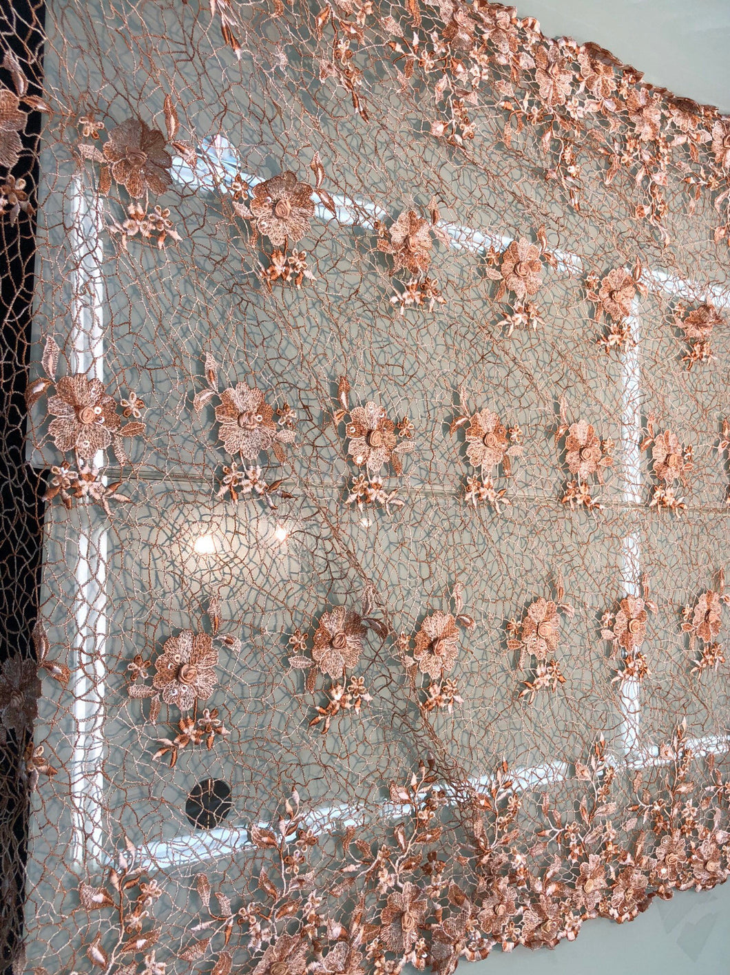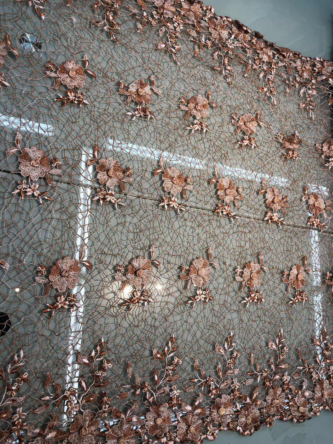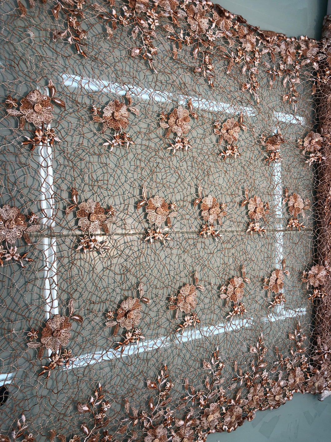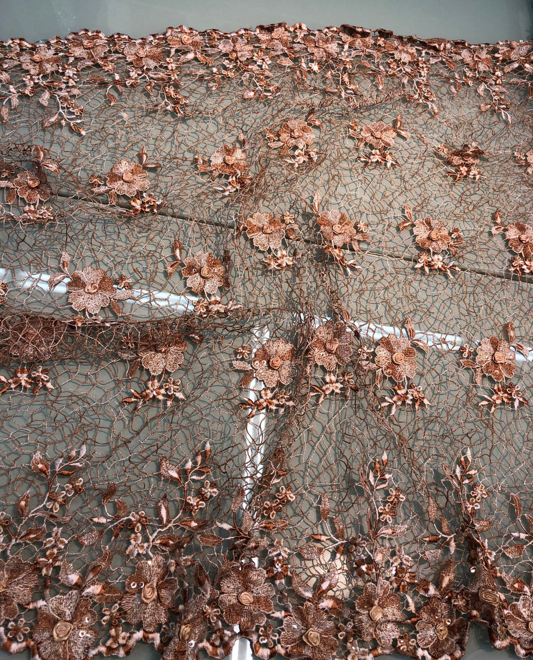 Crochet lace, beautiful floral crochet spiderweb lace with 3D flowers attached 39" wide copper color lace fabroc sold by the yard