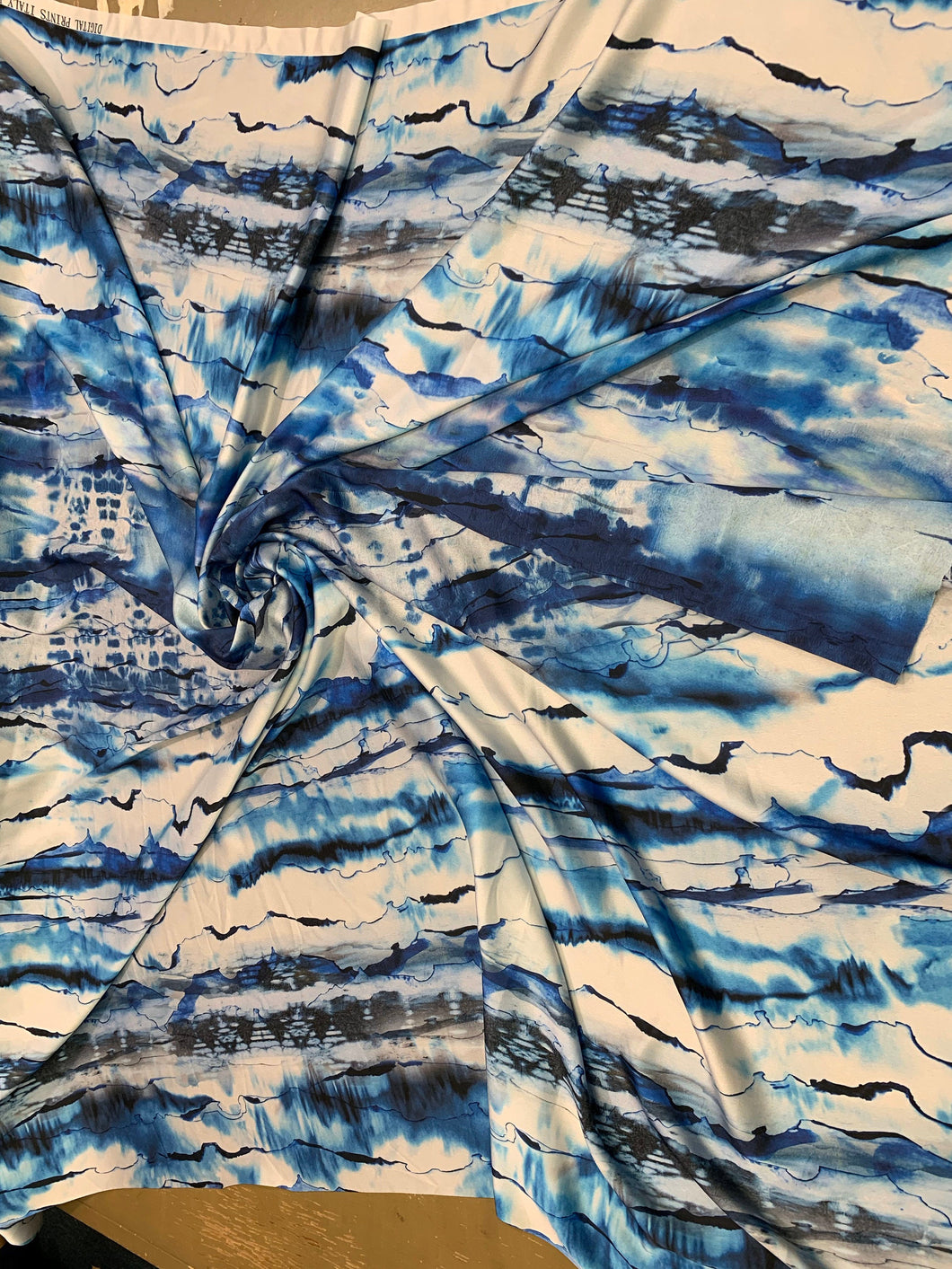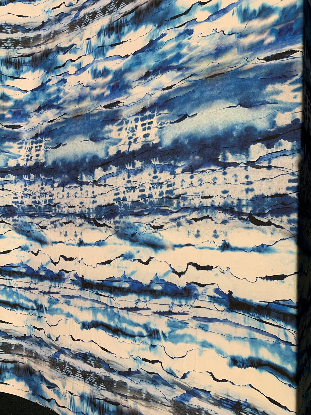 Designer digital printed Charmouse fabric 54â wide. Beautiful ivory base with blues printed fabric sold by the yard. Best use for apparel