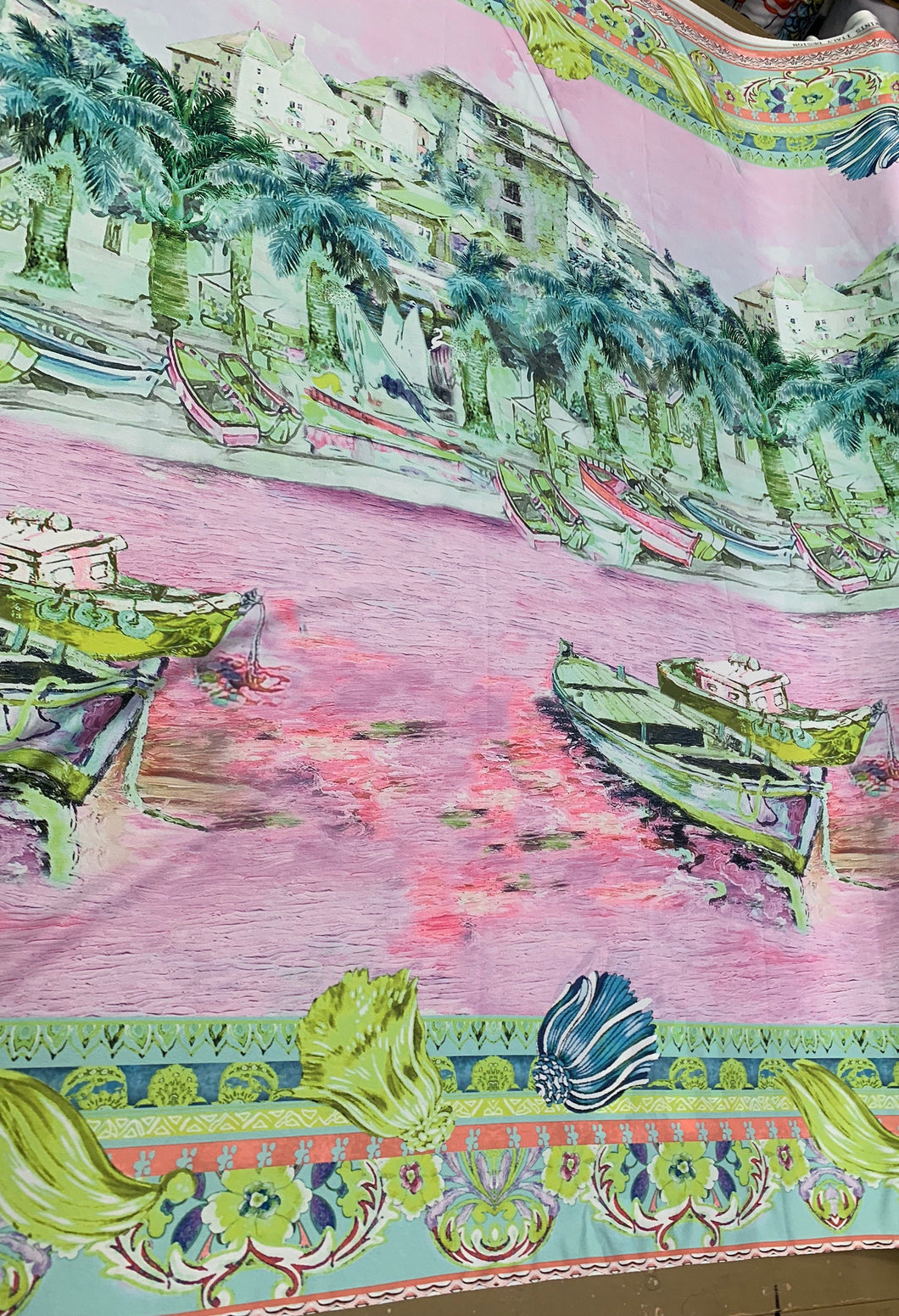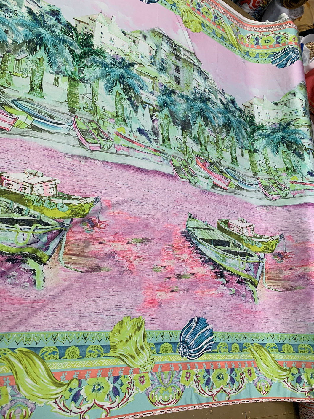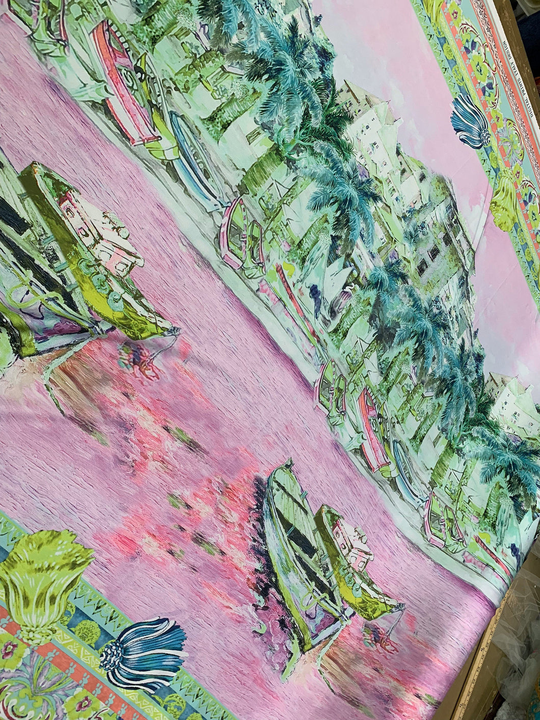 Designer digital printed Charmouse fabric 54â wide. Beautiful pink greenish landscape design sold by the yard. Best use for apparel