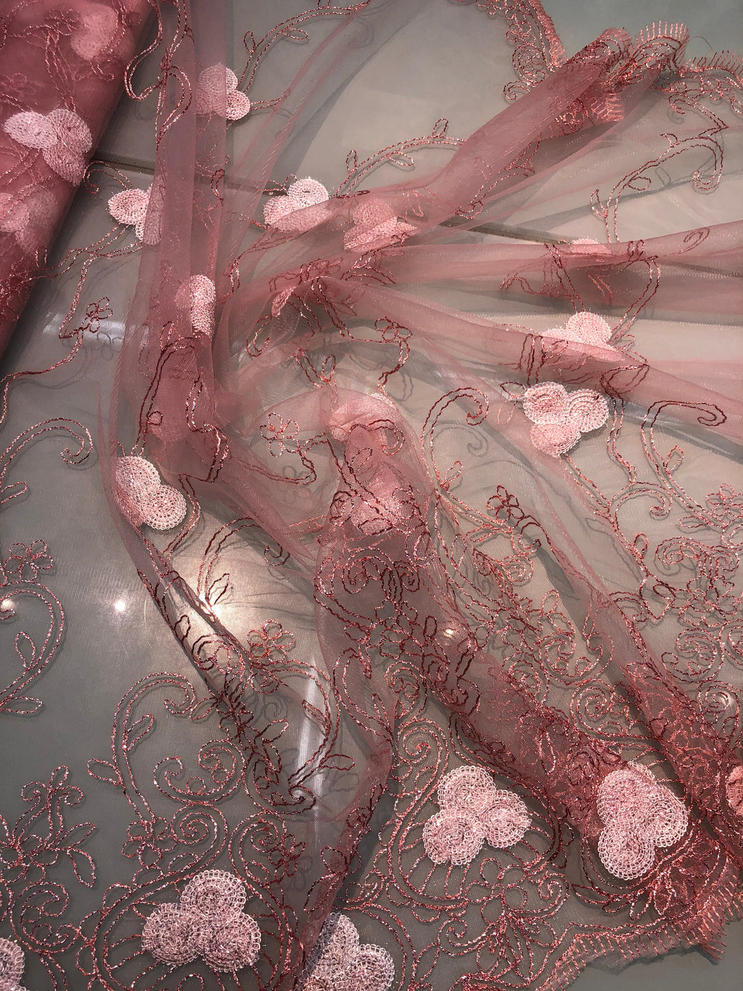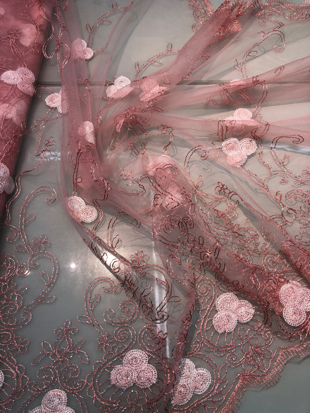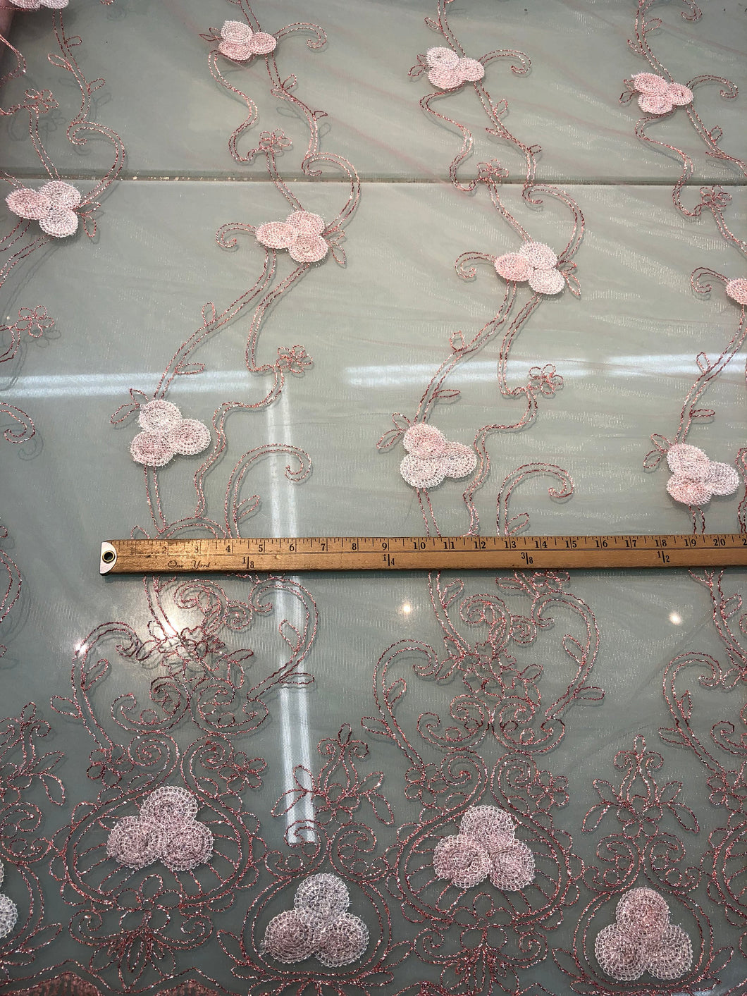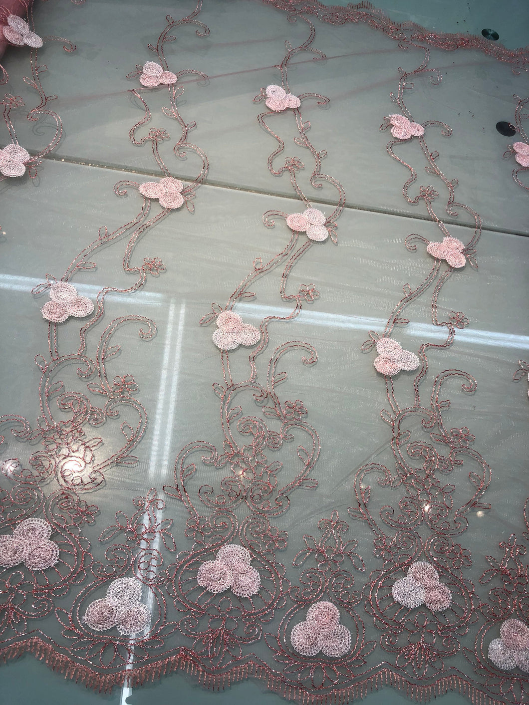 Embroidered net lace 50" wide Beautiful baby pink color embroidery on mesh Fabric sold by the yard