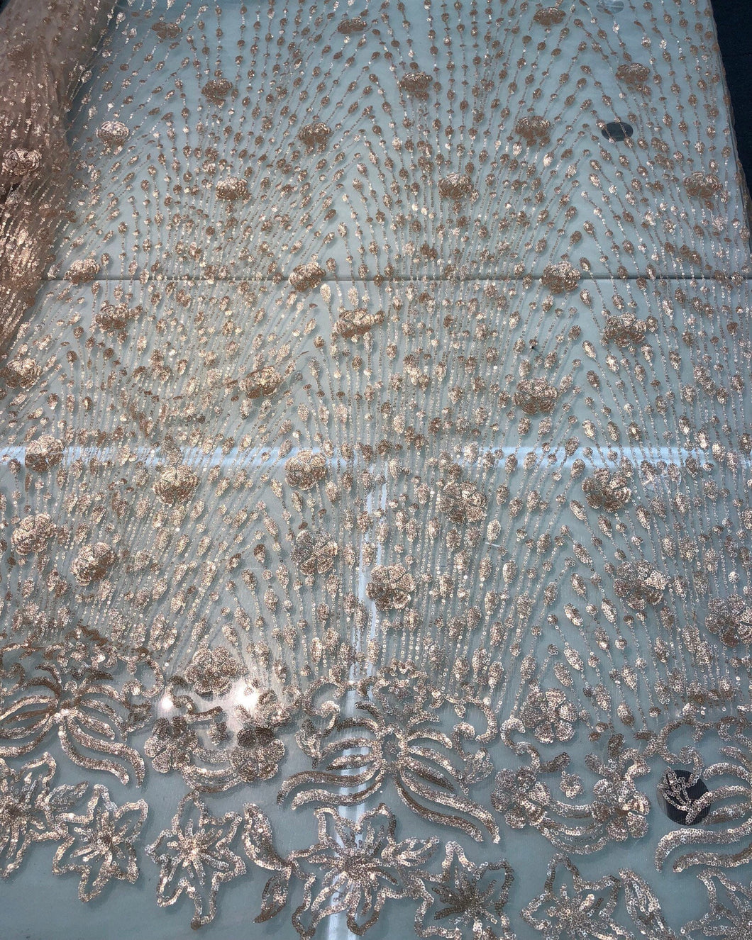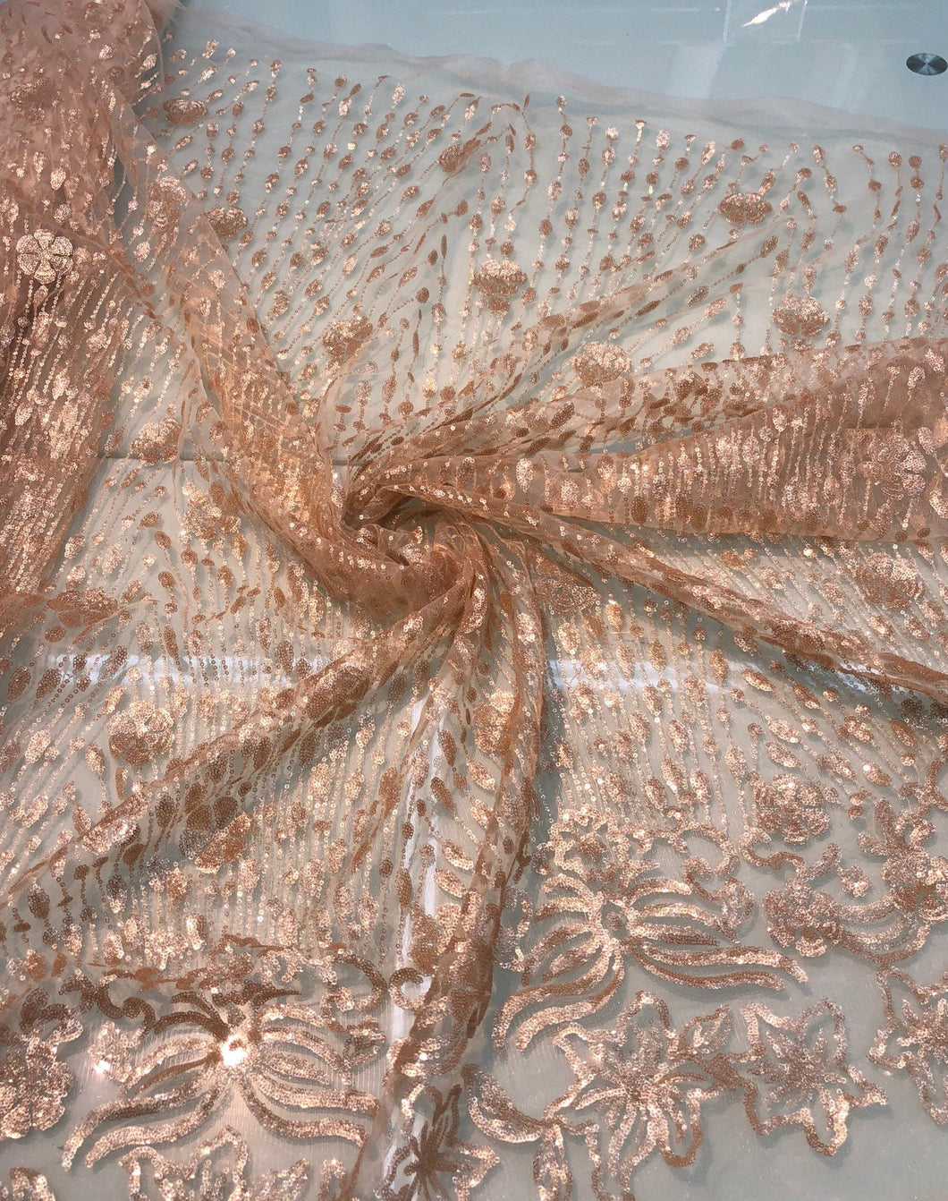 The sequins are embroidered on a mesh fabric. The Sequins has especial and extraordinary design.