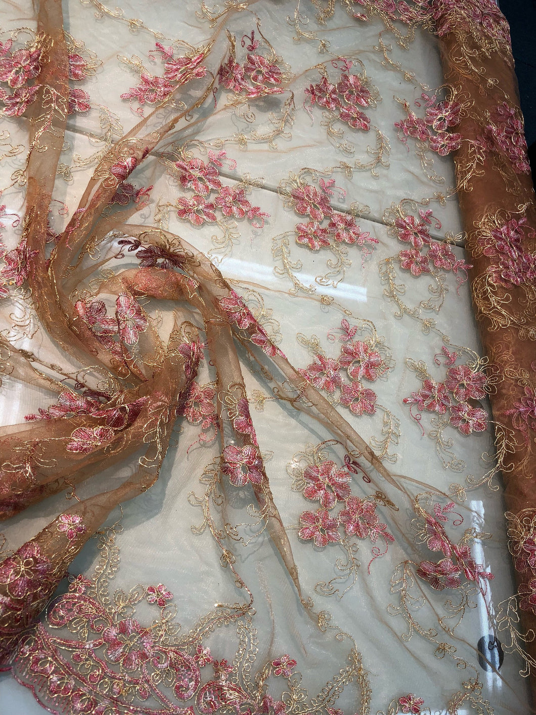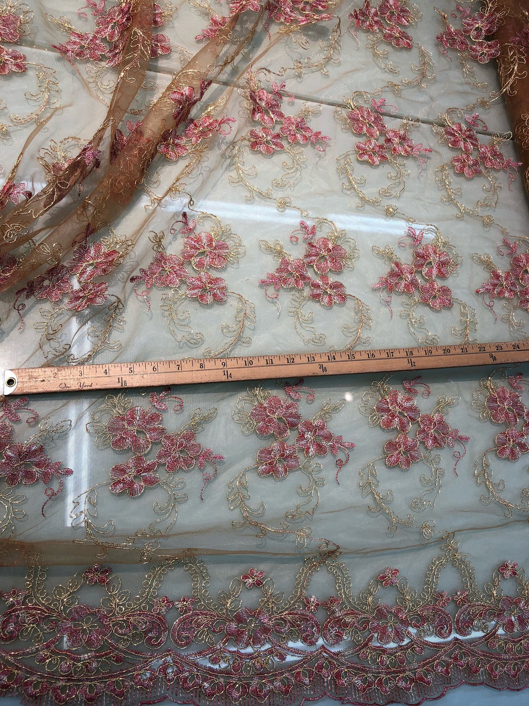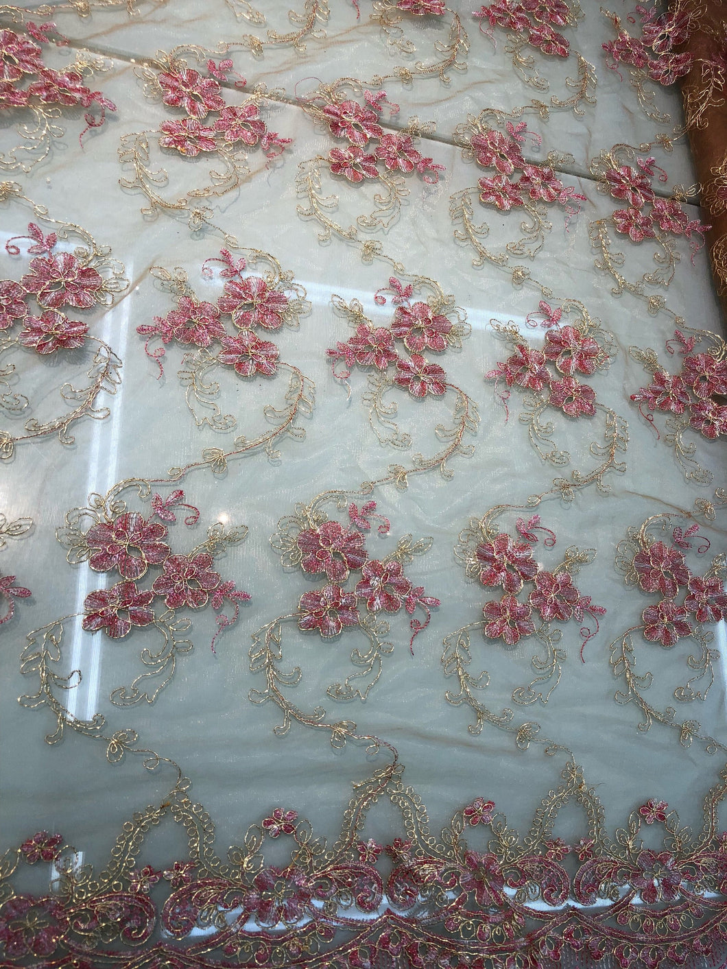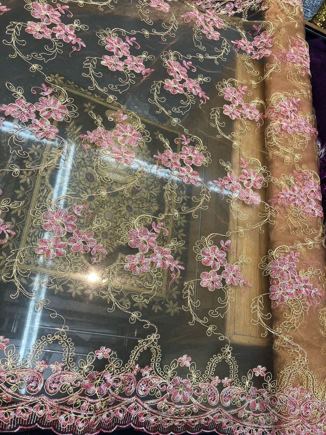 Gold mesh lace doubke side border 50" wide Beautiful gold meah woth pink embroidery Fabric sold by the yard