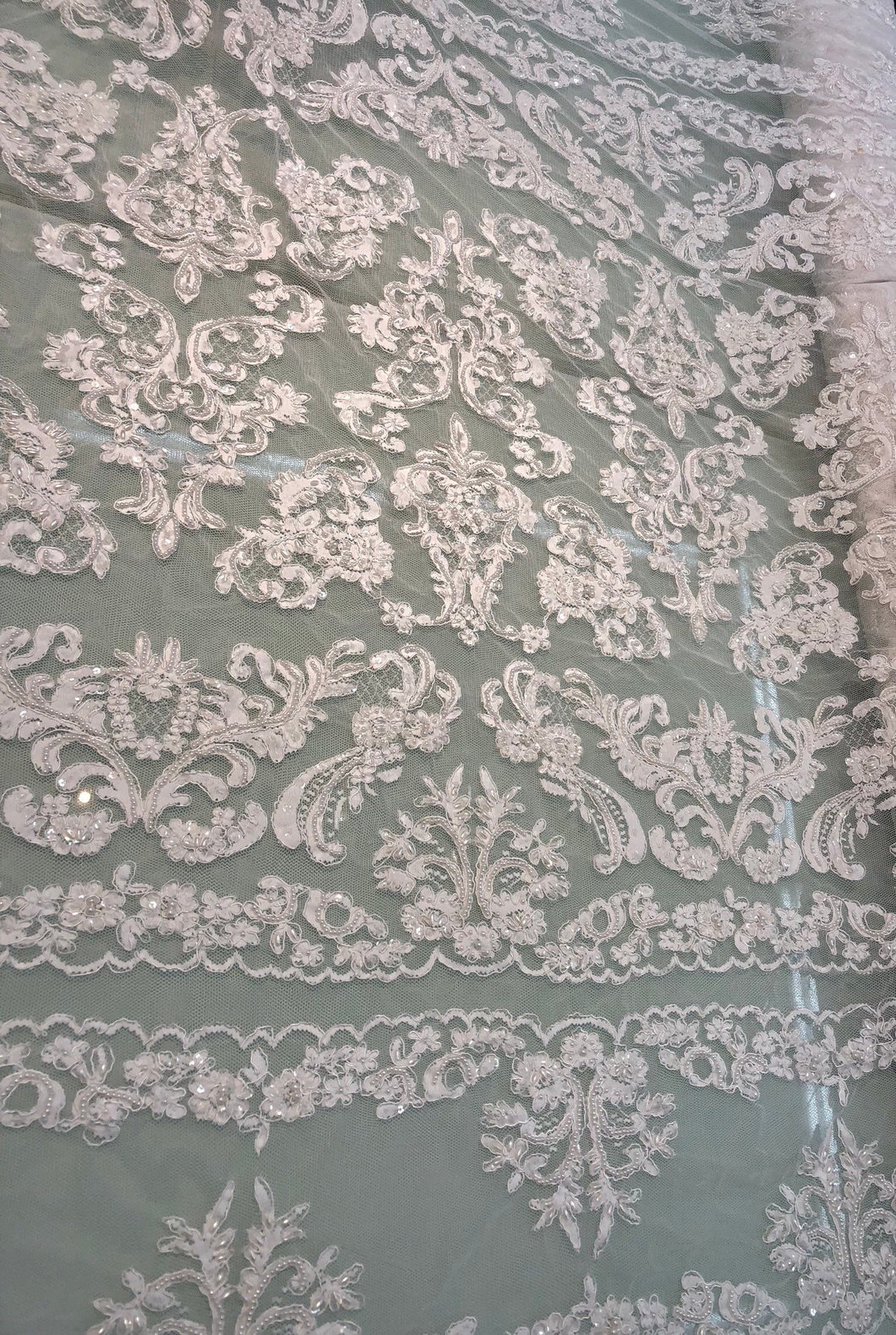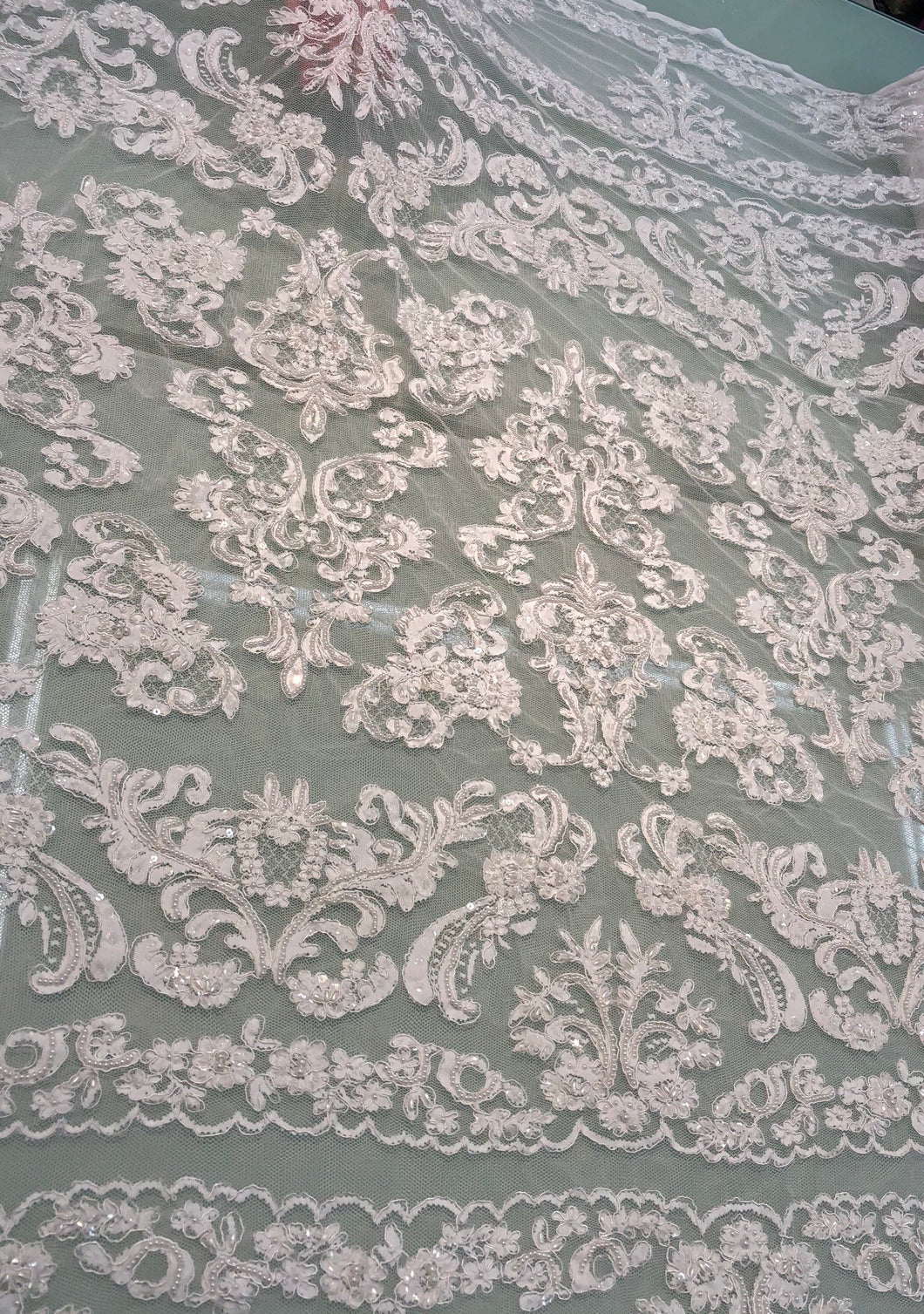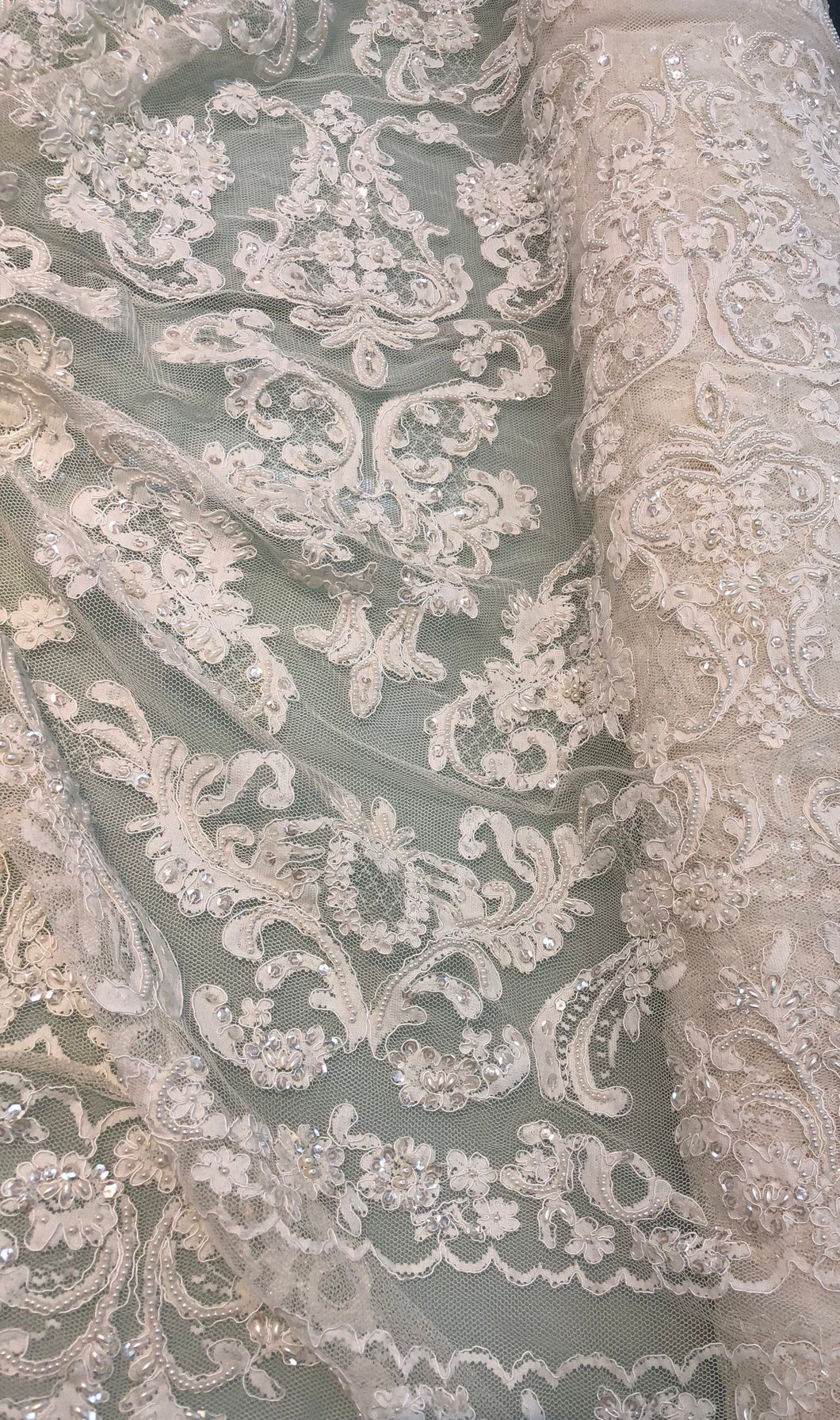 The floral border style hand beaded & sequins are embroidered on a mesh lace fabric. It is super elegant and classy embroidered Sequins on a mesh bridal lace can be use for dresses, gowns, Skirt, prom dresses, wedding dresses etc..... Other colors and custom color and designs available on special Request. 48” wide