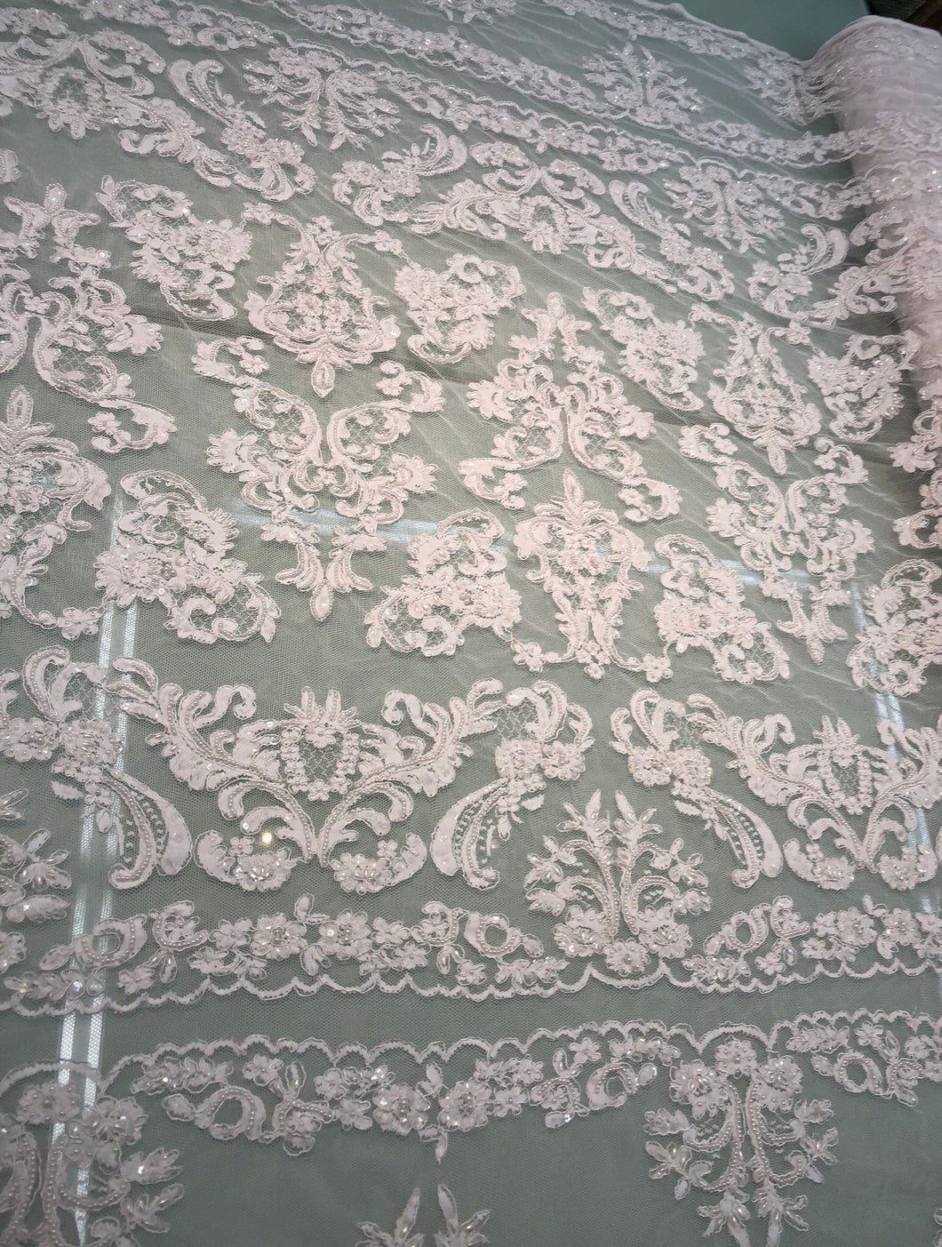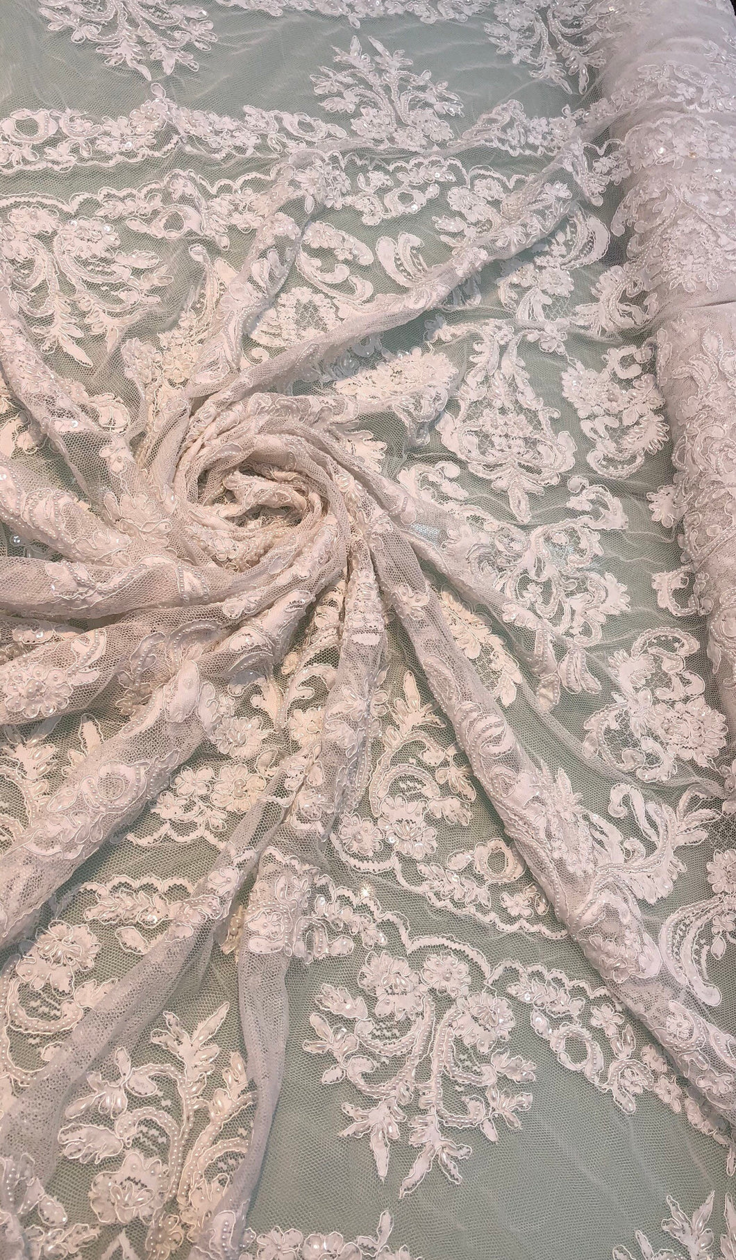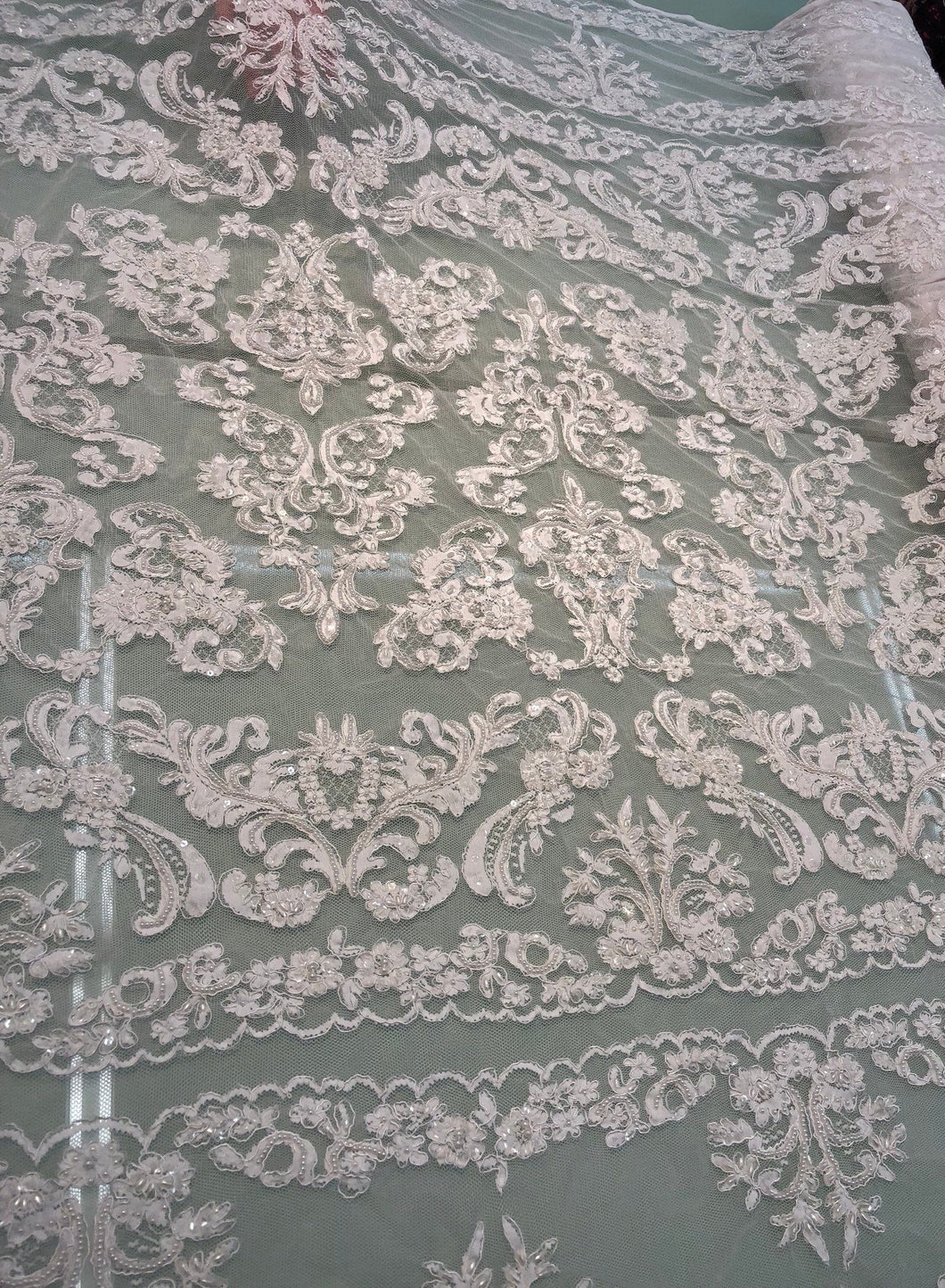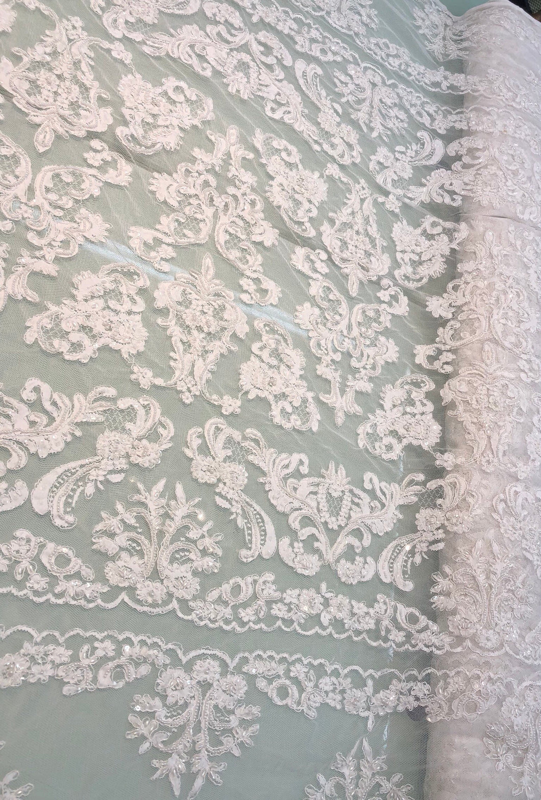 The floral border style hand beaded & sequins are embroidered on a mesh lace fabric. It is super elegant and classy embroidered Sequins on a mesh bridal lace can be use for dresses, gowns, Skirt, prom dresses, wedding dresses etc..... Other colors and custom color and designs available on special Request. 48” wide
