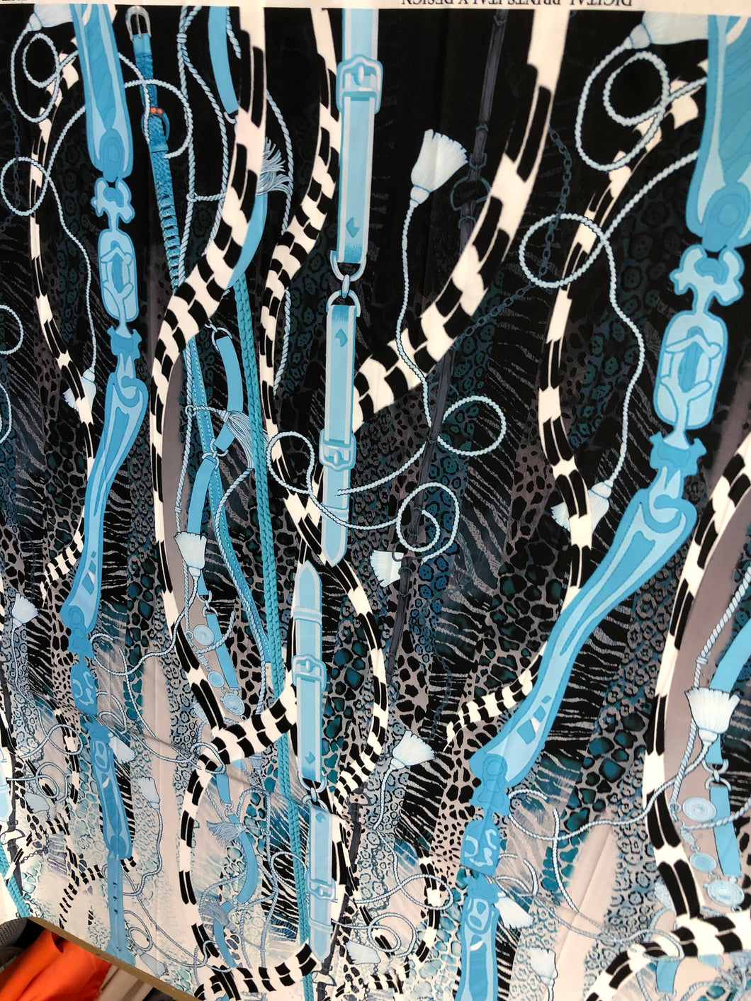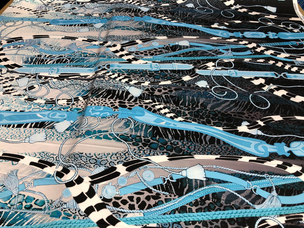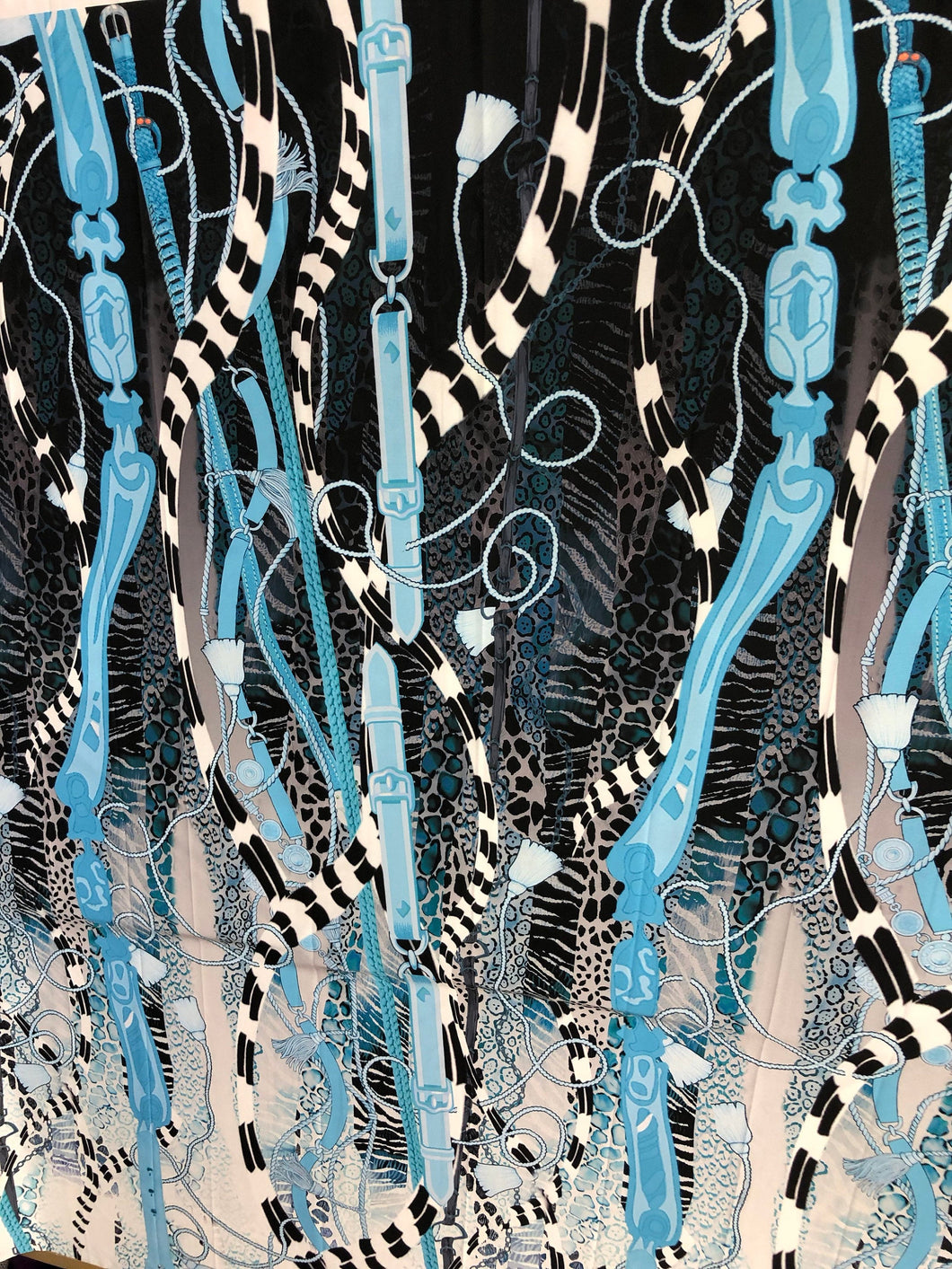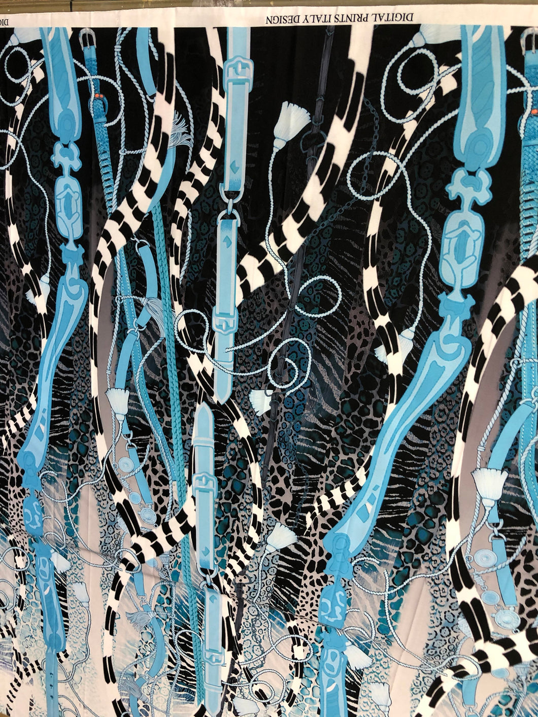 Satin charmeuse digital print 54" wide Beautiful blue black white belt design Soft silky fabric sold by the yard