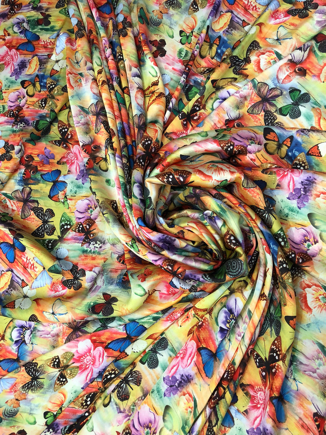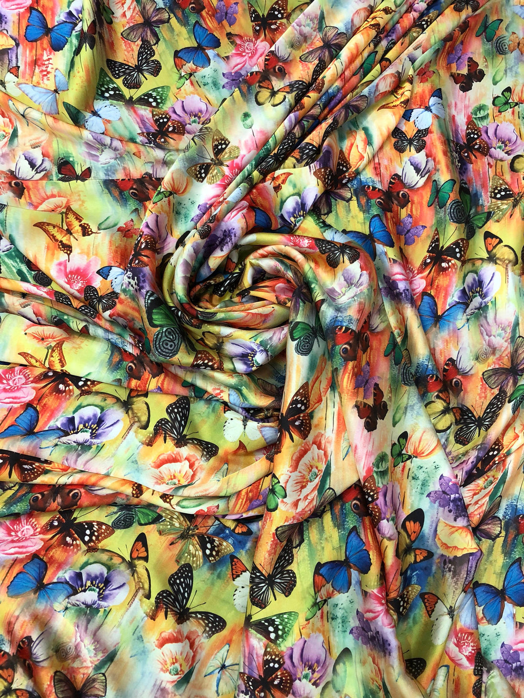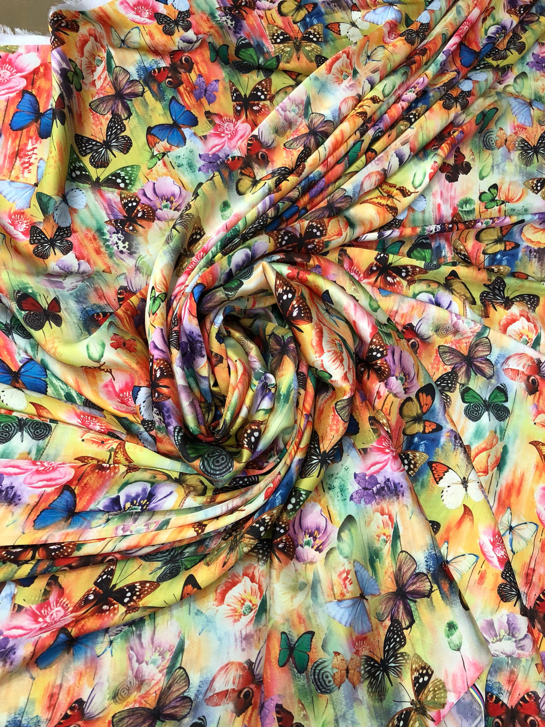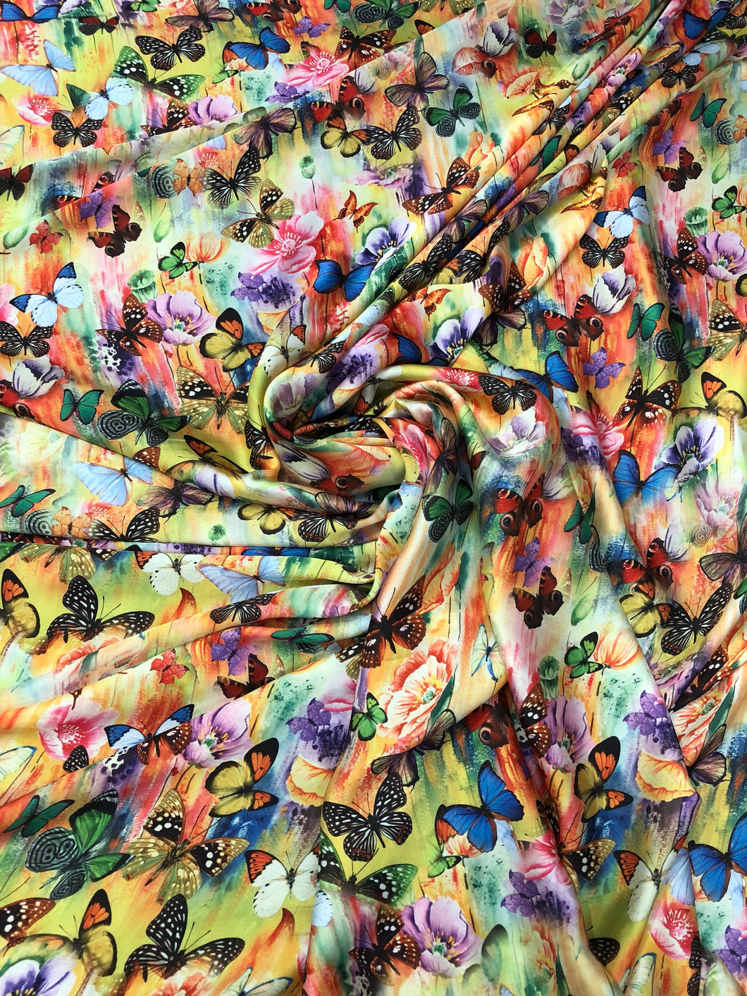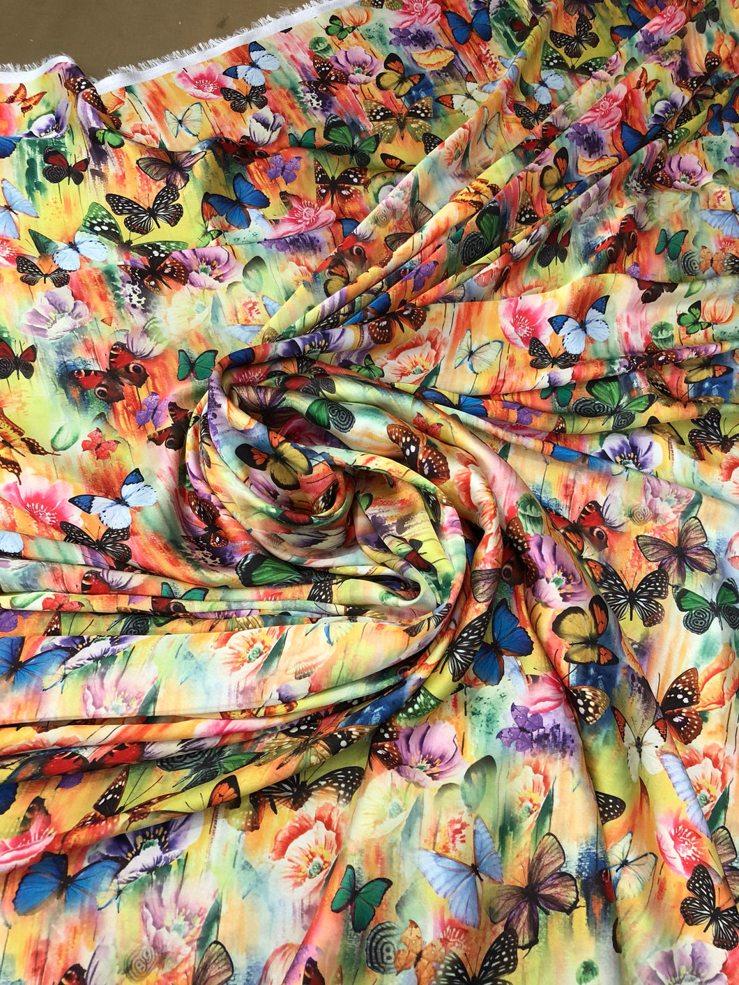 Satin charmeuse digital print 54" wide Beautiful butterfly design Soft silky favric sold by the yard