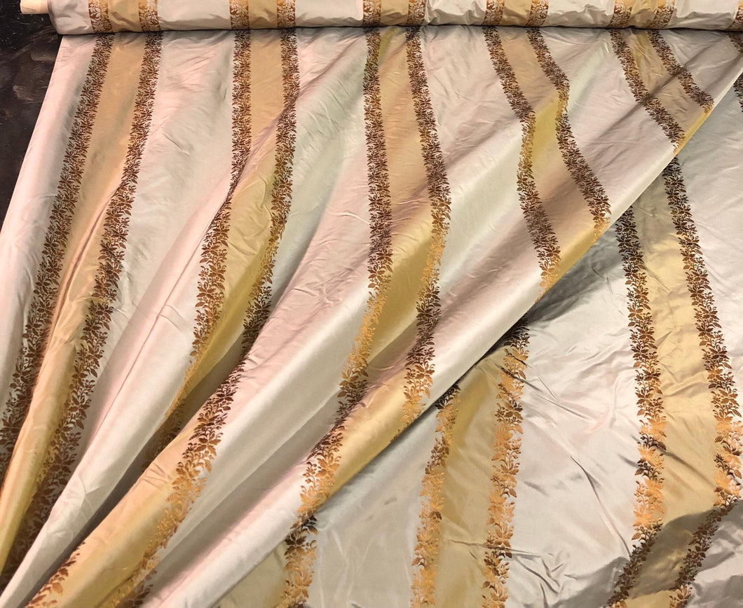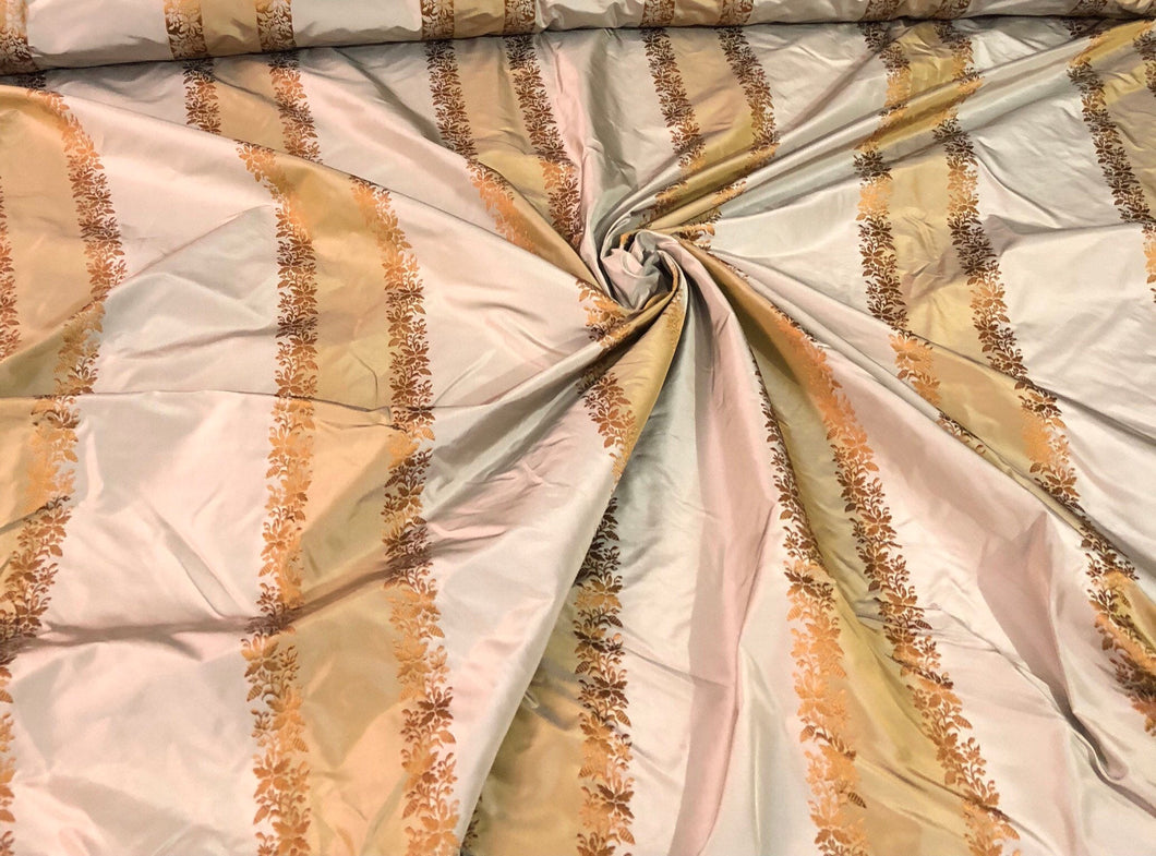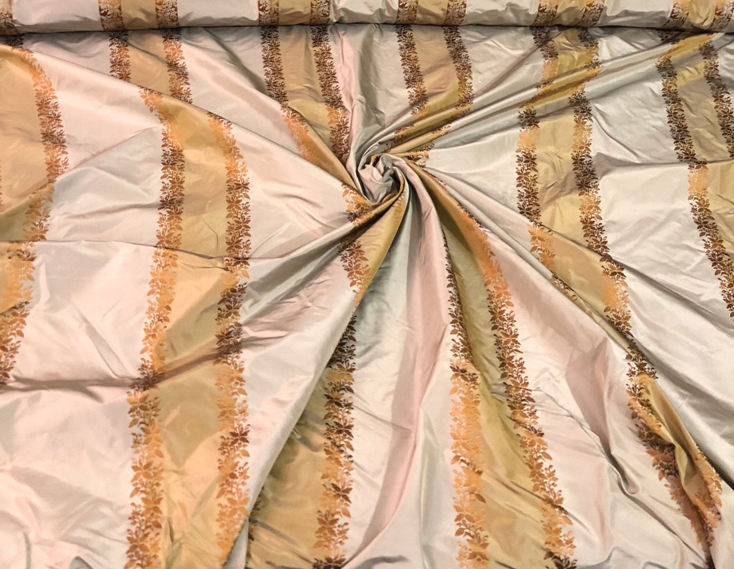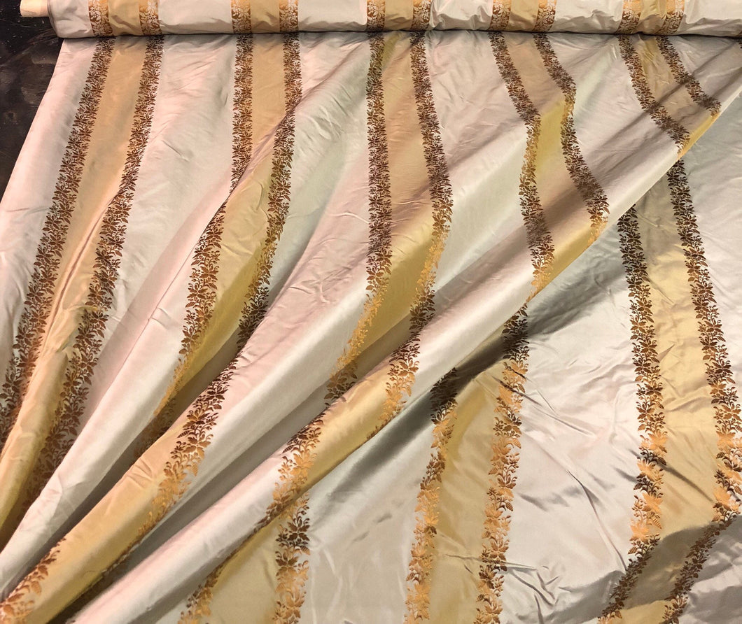 Silk taffeta 54" wide Beautiful grayish taupe rust gold stripe with ruat gold striped floral jaquard silk taffeta fabric sold by the yard