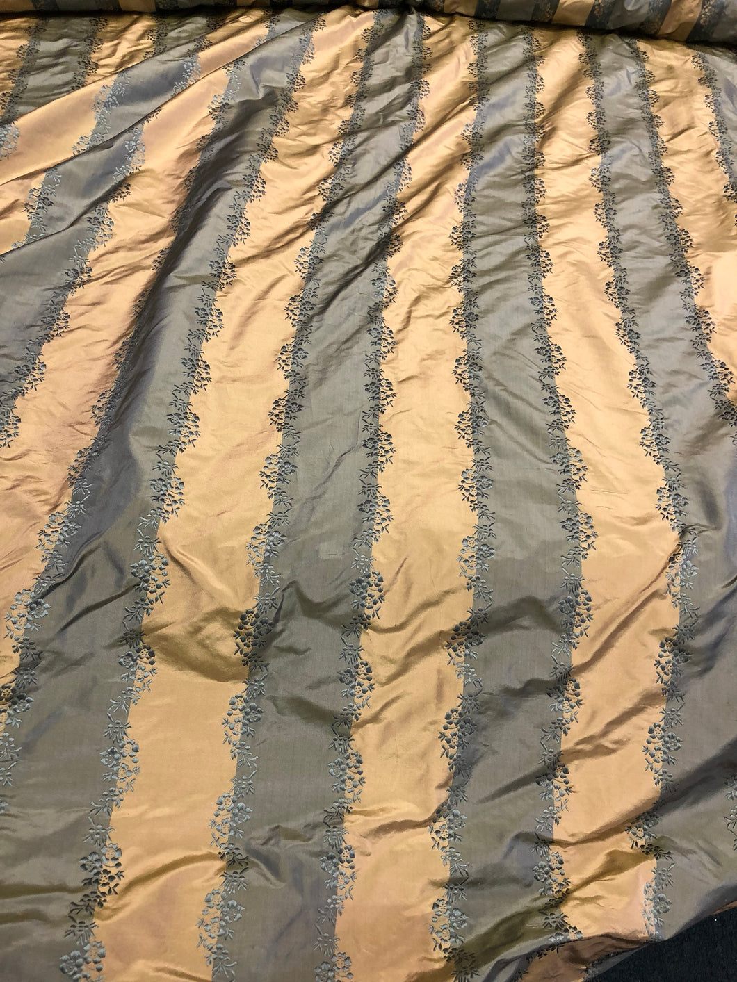 Silk taffeta 54" wide    Beautiful teal blue with gold jaquard stripe silk taffeta fabric sold by the yard