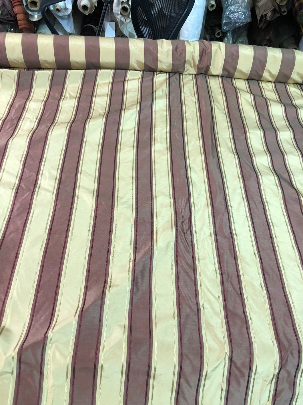 Silk taffeta jaquard stripe 54" wide                       Beautiful gold & wine color