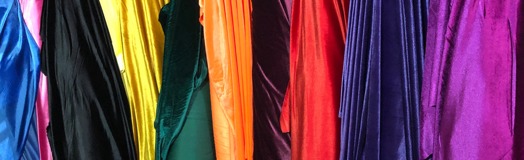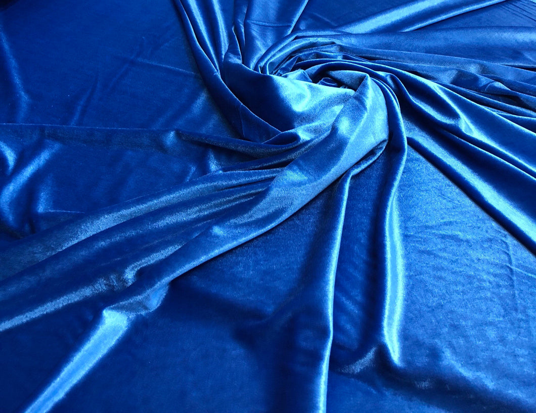 Stretch velvet 60â wide. Lots of beautiful colors available. Usable for appeal, long dress, short dress, scarp or a light jacket.