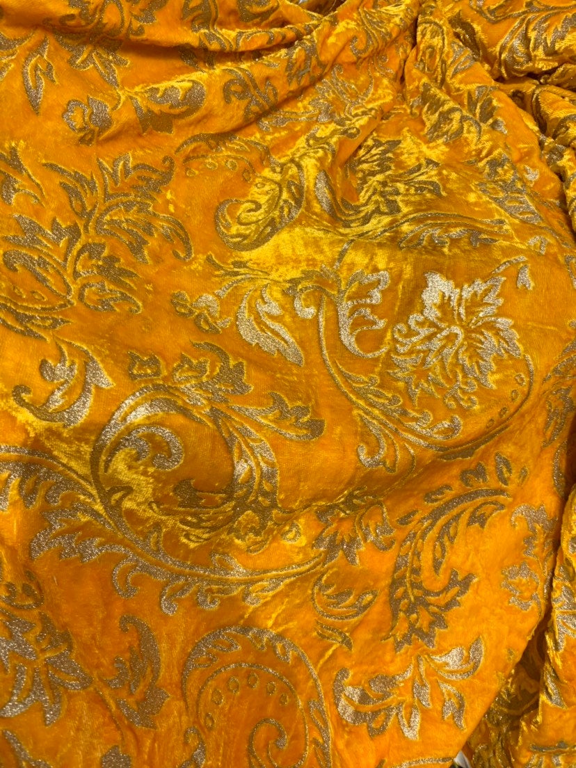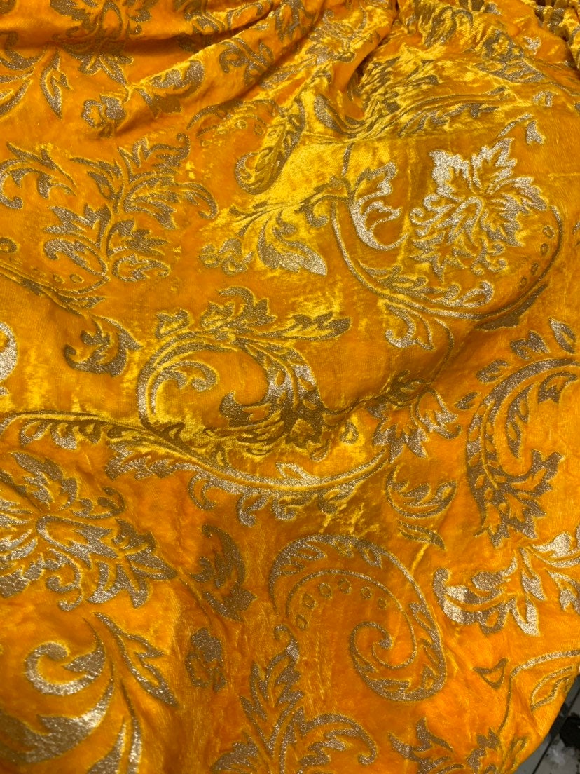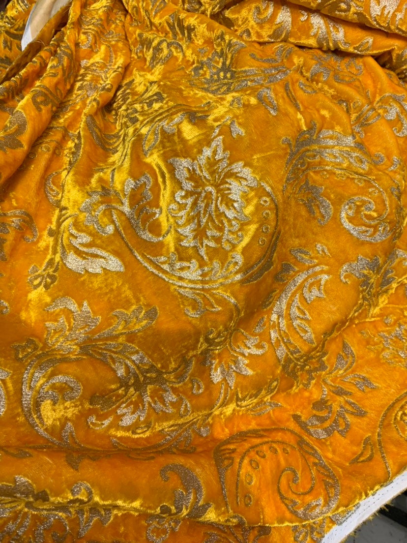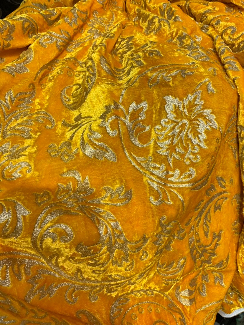 Damask style matalic embossed velvet 45” wide beautiful sun yellow gold embossed velvet sold by the yard. Best use for apparel & home furnishing or Theatrecal designer Custome.