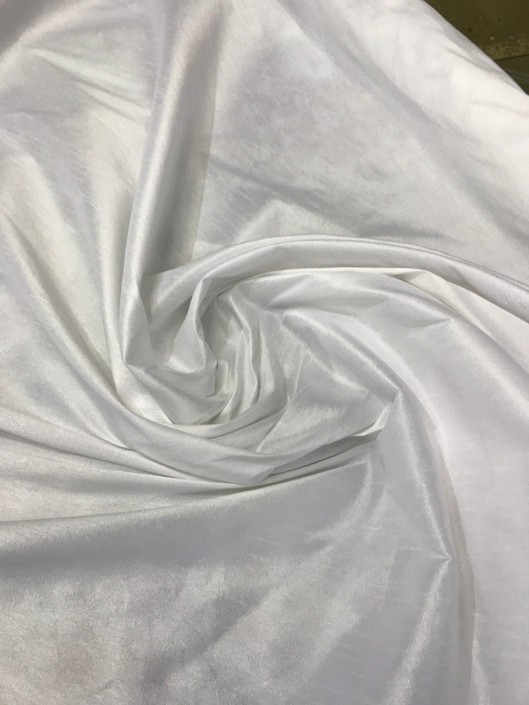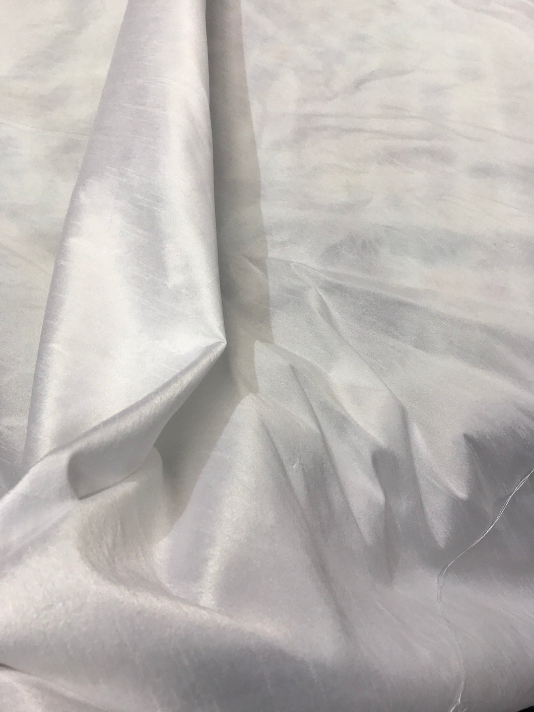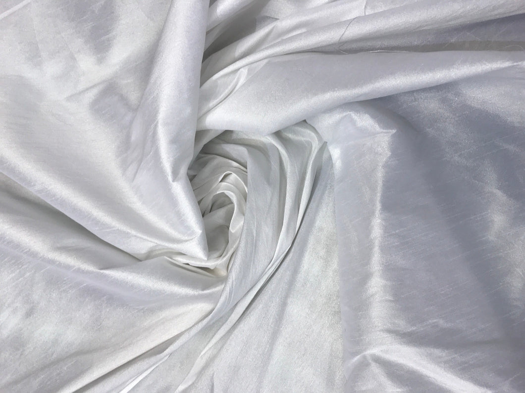 White Shantung/Dupioni fabric. 54" wide. Shantung fabric is unique blend makes this fabric soft and gives structure to dress.
